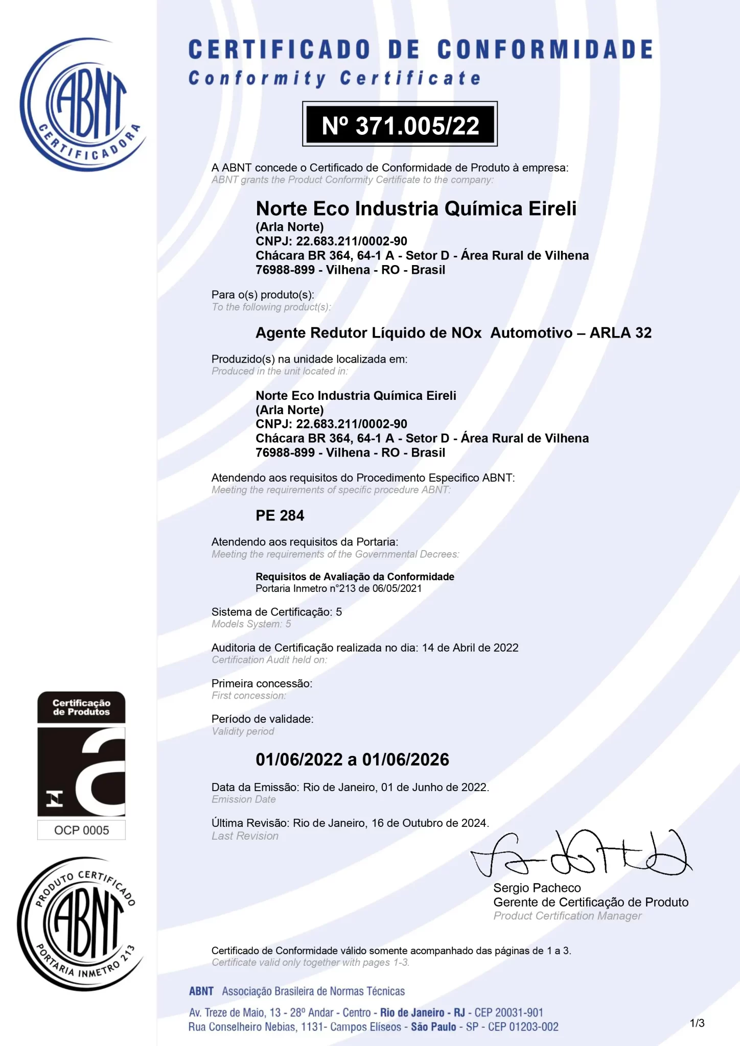 Certificado de Conformidade ABNT nº 371.005/22