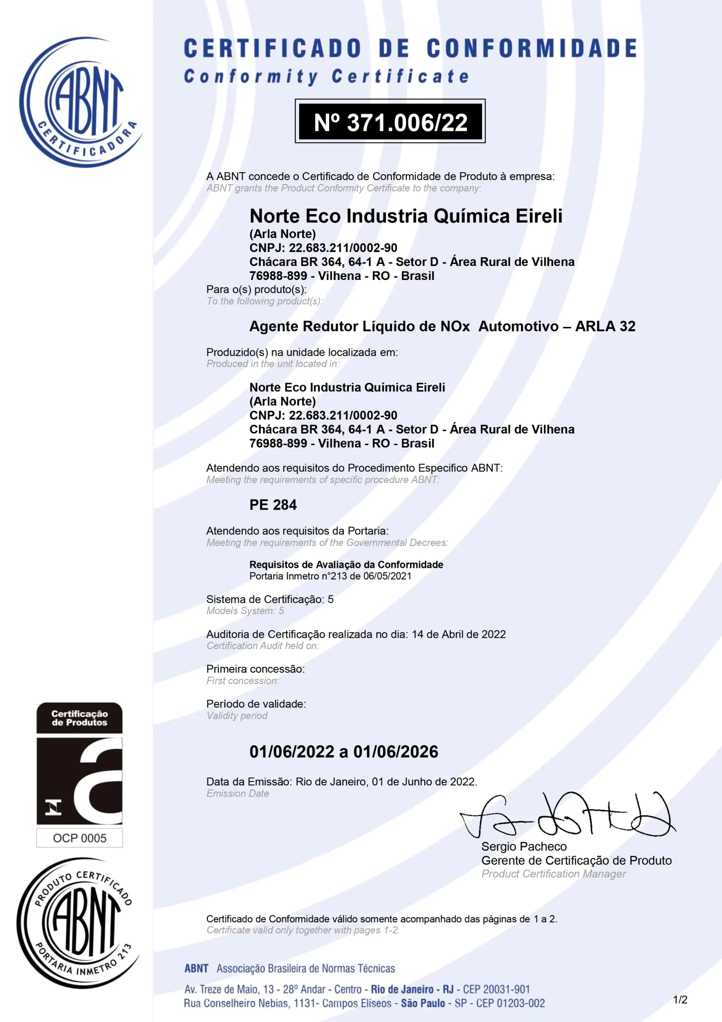 Certificado de Conformidade ABNT nº 371.006/22