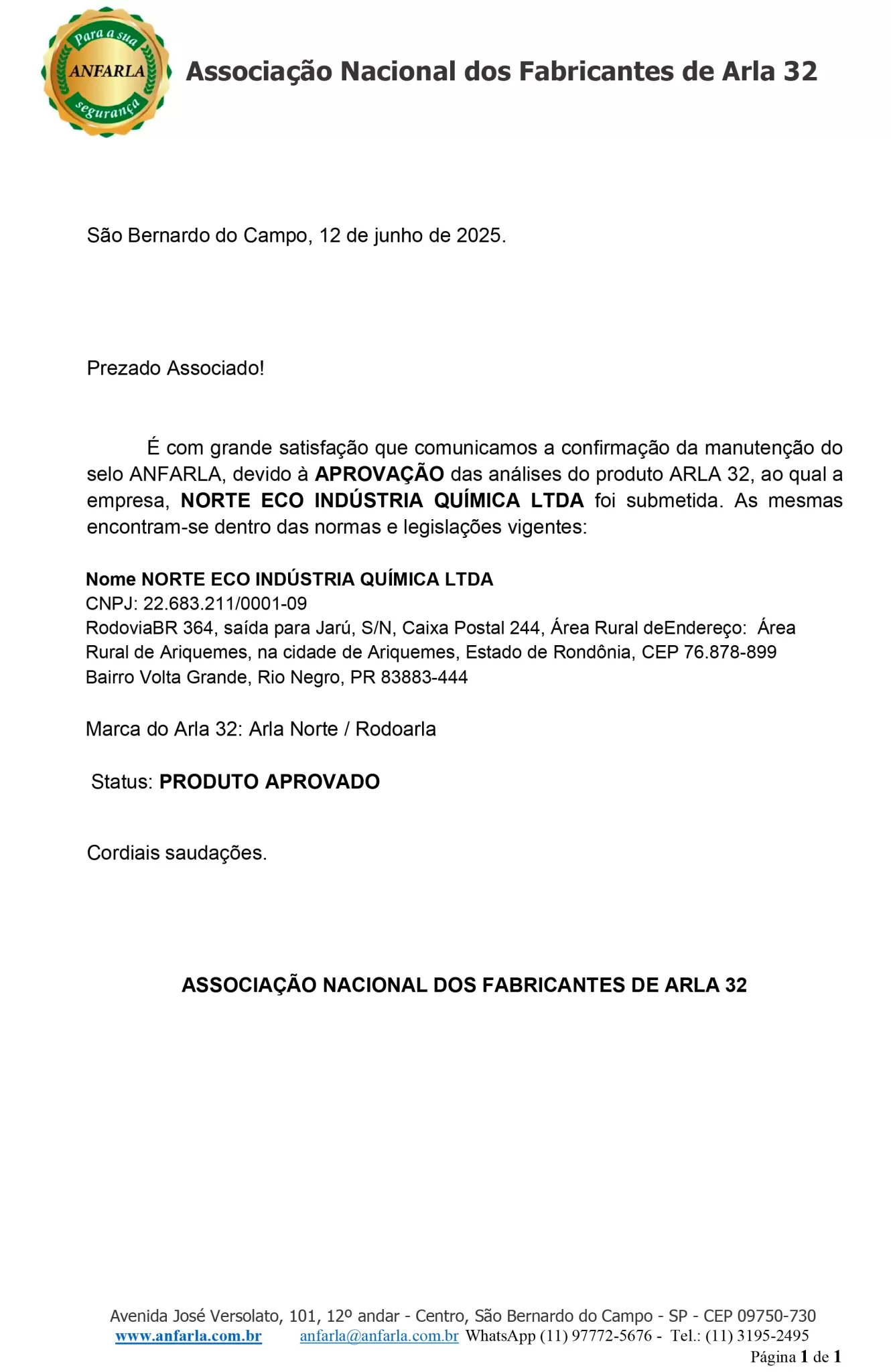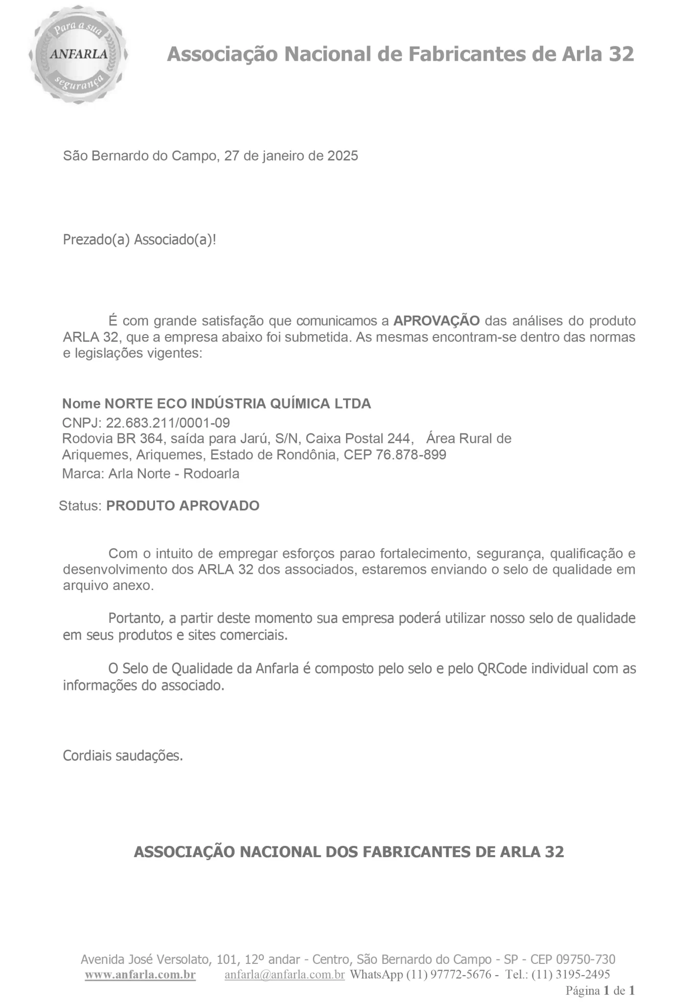 Produto aprovado com selo de qualidade emitido pela Associação Nacional dos Fabricantes de Arla 32. Ensaio técnico realizado pelo laboratório Falcão Bauer, acreditado pela Cgcre.